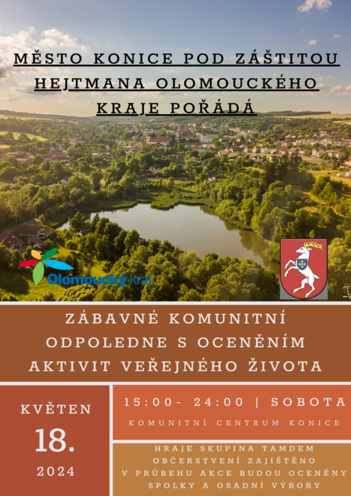 V sobotu 18. 5. od 15:00 hodin pořádá Konice Zábavné komunitní odpoledne s oceněním aktivit veřejného života. Vstupné je zdarma, k tanci a poslechu hraje skupina TAMDEM a zajištěno je bohaté občerstvení.
