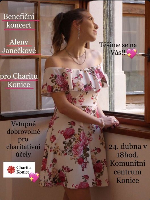 Charita Konice srdečně zve naše občany na benefiční koncert Aleny Janečkové pro Charitu Konice. V pátek 24. dubna v 18 hodin v Komunitním centru v Konici. Výtěžek bude použit na podporu nově budovaného sídla Charity Konice, které bude sloužit pro pracovníky a klienty pečovatelské a odlehčovací služby.