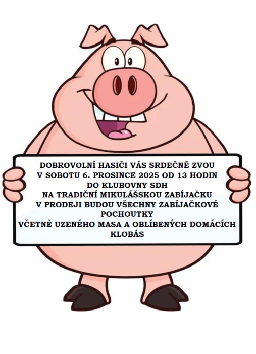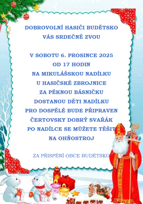 Dobrovolní hasiči Vás srdečně zvou v sobotu 6. prosince 2025 od 13 hodin do klubovny SDH na tradiční Mikulášskou zabíjačku. V prodeji budou všechny zabíjačkové pochoutky, včetně uzeného masa a domácích klobás. Od 17:00 hodin nás navštíví Mikuláš s anděli a čerty, aby dětem rozdali za pěknou básničku nadílku. Bude i ohňostroj a svařák. Akce se koná za přispění obce Budětsko.