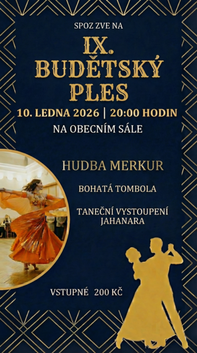 Sbor pro občanské záležitosti Budětsko Vás srdečně zve 10. ledna 2026 od 20:00 hodin na IX. společenský ples do obecního domu v Budětsku.