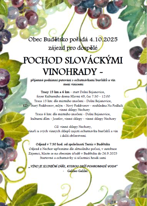Obec Budětsko pořádá 4.října 2025 Pochod slováckými vinohrady. Zájemci hlaste se na OÚ do 26. září 2025. Odjezd autobusu 7:30 od společnosti Terris Budětsko, viz. příloha.