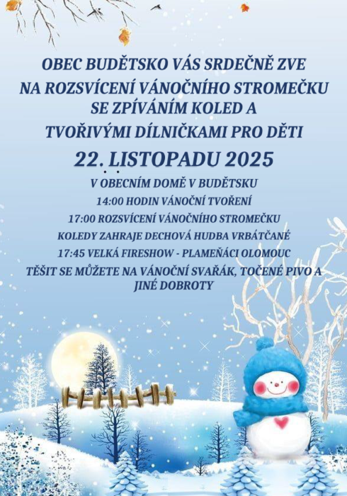 Obec Budětsko Vás srdečně zve 22. listopadu 2025 na rozsvícení vánočního stromečku s tvořivými dílničkami pro děti. Ve 14:00 hodin vánoční tvoření. V 17:00 rozsvícení vánočního stromečku s kalíškem svařáku a koledami, které zahraje skupina Vrbátčané. V 17:45 vystoupení skupiny Plameňáci Olomouc s velkou ohnivou show.