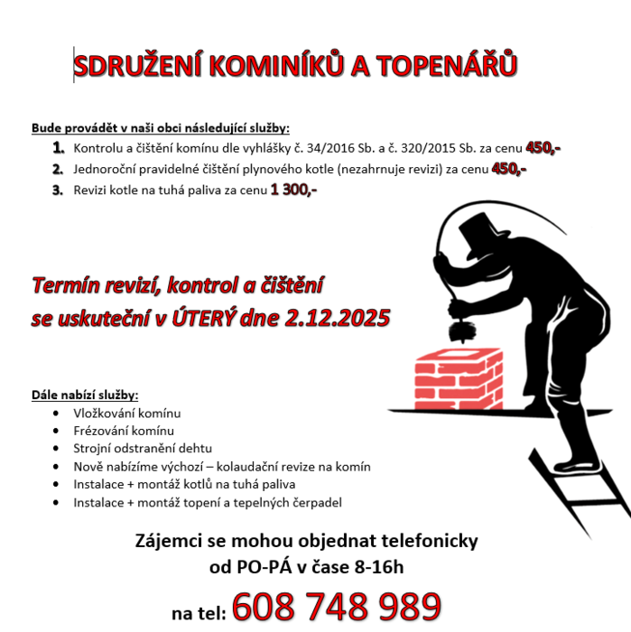 Sdružení kominíků a topenářů bude provádět v naší obci v úterý 2.prosince kontroly a čištění komínů, plynových kotlů, revize kotlů na tuhá paliva. Dále nabízí vložkování a frézování komínů, výchozí-kolaudační revize
