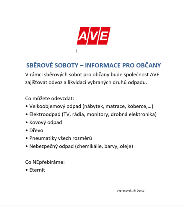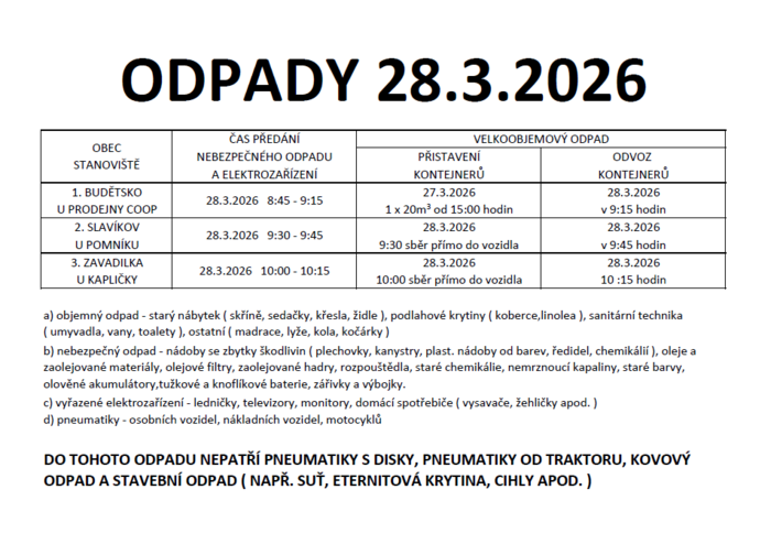 Oznamujeme občanům, že v sobotu 28. března proběhne svoz velkoobjemového a nebezpečného odpadu. V Budětsku bude kontejner na objemný odpad přistaven v pátek 27. března od 15:00 hodin. Na Slavíkově a na Zavadilce proběhne svoz objemného odpadu v sobotu společně s nebezpečným odpadem a elektrozařízením. Časy předání nebezpečného odpadu a elektrozařízení: Budětsko 8:45 – 9:15 hod., Slavíkov 9:30 – 9:45 hod., Zavadilka 10:00 – 10:15 hod.